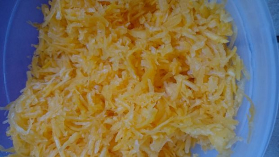 Тыквенные спагетти с курицей готовятся из тыквы специального сорта, мякоть которой после запекания распадается на волокна.
