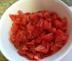 - Нарезаем помидоры небольшими кусочками и помещаем в глубокую тарелку.