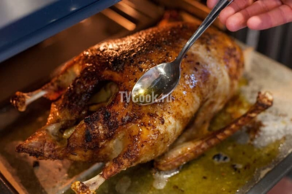 Разогрейте духовку до 250 градусов. Положите гуся на противень для запекания. По желанию можете его связать, чтобы ножки были вместе, а крылья плотно прилегали к туловищу и не топорщились. Отправьте гуся в духовку на 30 минут. Спустя пол часа, убавьте в духовке температуру до 180 градусов. Запекайте гуся в течение еще 3 часов, время от времени поливая его скапливающимся на дне топленым жиром.