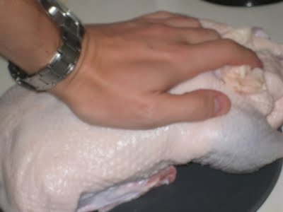 - Уложите гуся на разделочную доску грудкой вниз и с силой надавите на птицу рукой, таким образом, вы сломаете грудную кость, впоследствии вам будет легче фаршировать, зашивать и разделывать готового гуся.