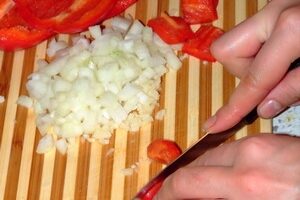 - Пока мясо тушится, подготовьте подливу. Промойте и обсушите болгарский перец, затем нарежьте кубиками. Лук нарежьте кубиками, а чеснок измельчите.