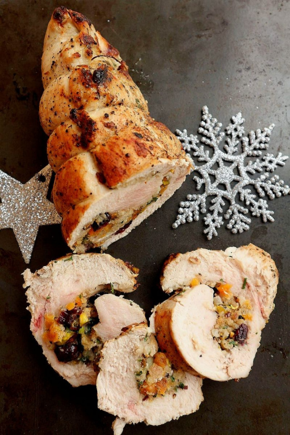 Рулет из индейки с сухофруктами и орехами нужно нарезать на ломтики и подавать на стол в красиво украшенной тарелке. Прекрасная идея для новогоднего и рождественского ужина. Приятного аппетита!
