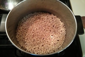 Тем временем ставим на сильный огонь казан или кастрюлю с толстым дном и добавляем воду в пропорции 1 часть гречки 2 части воды. Спустя некоторое время всыпаем в кипяток по вкусу соль и уже успевшую обсохнуть гречку.