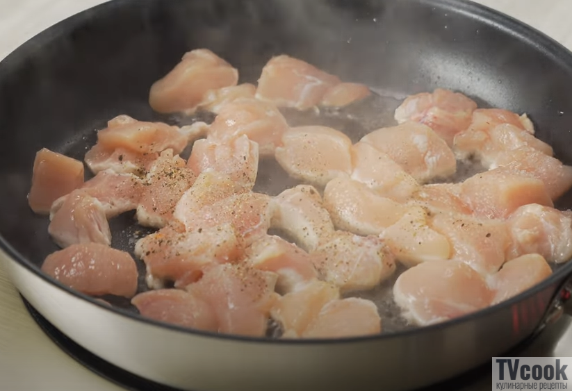 - Разогрейте сковороду с 1 ст.л. растительного масла, обжарьте куриное филе двумя одинаковыми партиями до готовности на сильном огне, примерно по 3-4 минуты, добавьте 1/2 ч.л. соли и 1/4 ч.л. черного перца.