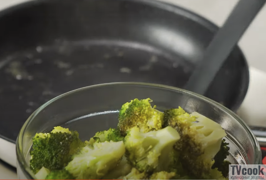 - Накройте сковороду крышкой и жарьте брокколи 5 минут на слабом огне. Переложите брокколи в миску.