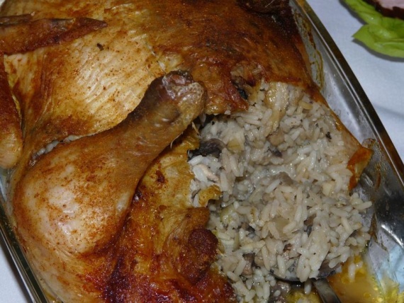 Курица в духовке целиком с начинкой — сытное и вкусное блюдо для званого или праздничного ужина. Курица получается ароматной и очень аппетитно выглядит из-за покрывающей ее румяной корочки. В качестве начинки я предлагаю использовать не пресловутую гречневую крупу, а более нежный по вкусу рис, смешанный с жаренными грибами.