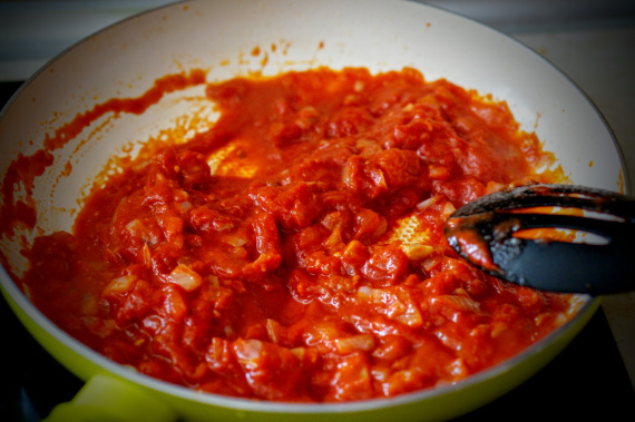 Добавьте к луку консервированные помидоры и продолжайте все готовить, помешивая еще в течении 10 минут. Следите за огнем и не забывайте перемешивать, чтобы ничего не горело.