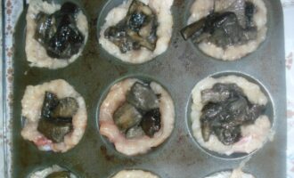 Смазать формочки для кексов маслом. Далее необходимо разделить фарш на 4 части и распластать фарш по дну и стенкам формочек. Выложить обжаренные грибы в образовавшееся углубление и залить сверху взбитой массой яйца и сметаны.