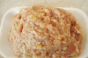 - Готовим куриный фарш. Если у вас нет готового, пропустите куриное филе и лук через мясорубку. Фарш посолите и поперчите. Разделите его на 2 части.