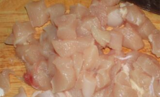 Куриное филе нарежем ножом на разделочной доске на маленькие кубики и переложим в миску. Чем аккуратнее и ровнее будет кубики, тем симпатичнее будет смотреться готовый рулет.