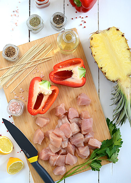 На деревянные шпажки нанизывайте кусочки маринованного куриного филе, чередуя их с ананасом и болгарским перцем. Закончить и начать вы должны с кусочка курицы, а в целом порядок ингредиентов не так важен, лишь бы они шли друг за другом.