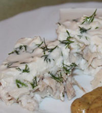 - Перед подачей на стол, аккуратно нарежьте заливное «Курица под снегом» на порции. Подавайте с майонезом и свежим овощным салатом.