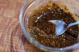 В глубокую пиалу выливаем острую горчицу, а также высыпаем молотый сушеный орегано, мускатный орех, розмарин, свежемолотый черный перец и соль. Воспользовавшись столовой ложкой, все тщательно перемешиваем до образования однородной массы. Все, маринад готов!