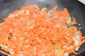 - В сковороду наливаем оставшееся растительное масло и ставим на средний огонь. Когда содержимое емкости хорошо разогреется, выкладываем сюда измельченный лук. Время от времени помешивая деревянной лопаткой, обжариваем компонент до прозрачности. Сразу же после этого добавляем в сковороду морковную стружку и продолжаем готовить зажарку. Внимание: не забываем помешивать все подручным инвентарем, чтобы овощи не пригорели у основания. Когда морковка с луком станут нежно-золотистого цвета, выключаем конфорку, а емкость отставляем в сторону.