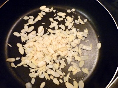 После этого, убавьте слегка огонь, полейте сверху рыбу свежевыжатым соком лимона. Продолжайте готовить еще минут 5-7, периодически переворачивайте рыбу, чтобы она равномерно поджарилась с обеих сторон. В другой чистой сковороде поджарьте до легкого румянца миндаль. При этом масло добавлять не нужно, обжаривайте на среднем или маленьком огне, постоянно перемешивая орехи деревянной лопаткой, чтобы они не подгорели.
