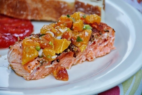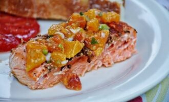 - Подавайте блюдо. Выложите горячее филе лосося на тарелку, обильно полейте апельсиновым соусом и сразу подавайте.
