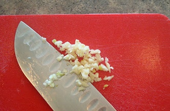 - Чеснок выкладываем на разделочную доску и с помощью острия ножа слегка придавливаем, мелко рубим. Измельченный чеснок пересыпаем в блюдце с укропом.