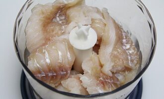 Филе трески необходимо разморозить и тщательно промыть в воде. Далее разрезаем его на кусочки, шириной примерно 2-3 сантиметра. При этом необходимо удалять все кости из филе. После чего куски рыбы вновь промываем и немного обсушиваем бумажными полотенцами. Помещаем подготовленное филе в контейнер блендера и тщательно измельчаем по состояния пюре.