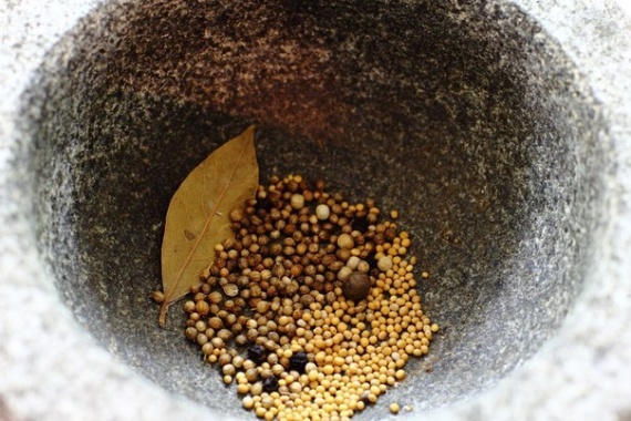 - Все специи, кроме перца чили, поместите в ступку и хорошо разомните толкушкой. Так же вы можете перемолоть специи с помощью блендера, только не переусердствуйте, превратив их в пыль, грубой крошки будет вполне достаточно.