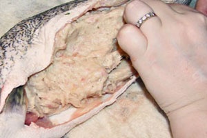 Как только тушка очистится от загрязнений, сушим ее бумажными кухонными полотенцами, выкладываем на разделочную доску и острием ножа делаем небольшой лунообразный надрез под головой. Очень аккуратно вспарываем брюхо до анального отверстия и извлекаем из рыбы внутренности. Действуем осторожно, так чтобы не повредился желчный пузырь с яркой желто-зеленой жидкостью, который находится практически у самого основания печени. Если его содержимое выйдет наружу, мясо сома будет горчить!