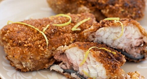 Сухую чистую сковороду поставьте на средний огонь, хорошенечко разогрейте, затем всыпьте в нее, предварительно очищенные от скорлупы, ядра грецких орехов. Периодически перемешивая, обжаривайте орехи в течение 10 минут. Затем, когда орехи чуть потемнеют, снимите сковороду с огня, остудите. Орехи размельчите вручную или с помощью ступки в мелкую крошку. После этого добавьте к ним цедру лимона и панировочные сухари, тщательно все перемешайте. Яйцо разбейте в небольшую мисочку и слегка взбейте при помощи вилки.