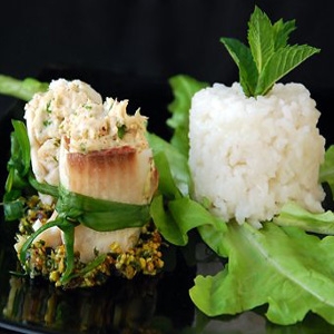 Все составляющие для блюда тилапия с мятным песто готовы. Осталось дело за главным – формируем рулеты! Запеченный плотный кусочек филе тилапии аккуратно выложите на тарелку. На тонкий край кусочка рыбы там, где раньше были реберные кости, уложите фарш из креветок, сыра и шпината. Очень аккуратно так чтобы не повредить рыбу сверните рулет и обвяжите его двумя перышкам зеленого лука. Возьмите большую круглую тарелку, на ее середину аккуратно столовой ложкой выложите мятное песто, у вас должно получиться небольшое озеро. Белое оставшееся пустым место вокруг озера из песто оформите мытыми и обсушенными кухонным бумажным полотенцем листьями салата. В середину озера из песто поставьте свернутый рулет из тилапии а на салат уложите отварной рис. Тилапия с мятным песто готова. Перед подачей разогрейте блюдо в микроволновке в течение 1 – 2 минут на маленьком уровне.