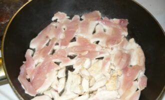 - Для начала, разморозьте куриное филе, очистите его от пленок и жировых прослоек. Нарежьте мясо тонкими полосками и промойте.
