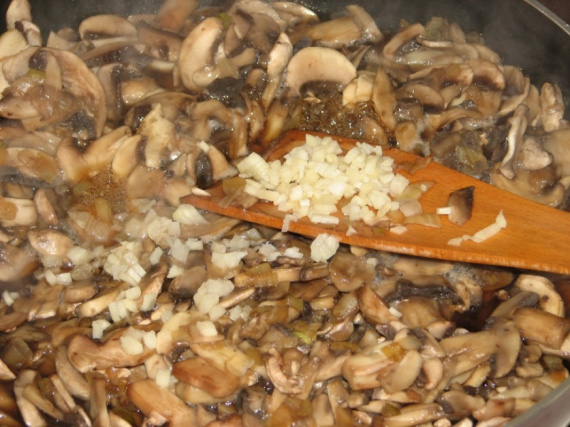- Когда из грибов выпарится большая часть жидкости, добавьте к ним измельченный чеснок и перемешайте.