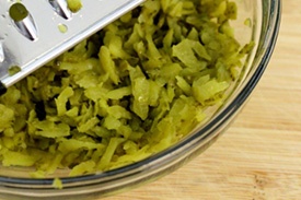 - Маринованные огурцы выкладываем на разделочную доску и ножом отрезаем края. На самом деле данные компоненты можно измельчить двумя способами, так как в любом случае они выделят достаточно сока. Первый: просто натираем соленые овощи с помощью мелкой терки прямо над чистой тарелкой.