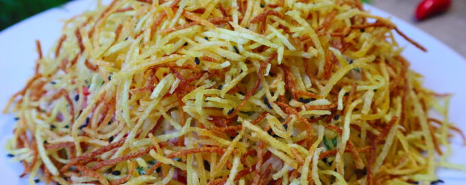 • Картофель чистим и моем. Трем на терке для моркови по-корейски. Промоем три раза, каждый раз в чистой холодной воде, чтобы максимально избавиться от крахмала. Просушим бумажными салфетками. В сотейник нальем достаточное количество растительного масла и обжарим картофель небольшими порциями на среднем огне до готовности. Жарится он быстро. Готовый картофель вынимаем на бумажные салфетки, чтобы стекло лишнее масло.