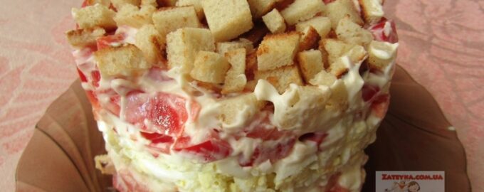 Рецепт сырного салата с курицей и сухариками предлагает сочетание нежного куриного филе, свежих овощей, тёртого сыра и ароматного