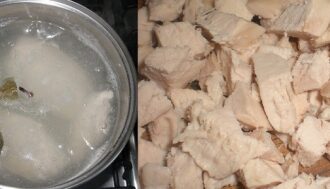 - Отварите куриное филе в подсоленной воде. За 10 минут до готовности добавьте лавровый лист и душистый перец. После приготовления остудите филе и нарежьте кубиками.