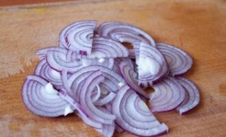 - Красный лук нарежьте тонкими полукольцами, морковь натрите на мелкую терку.