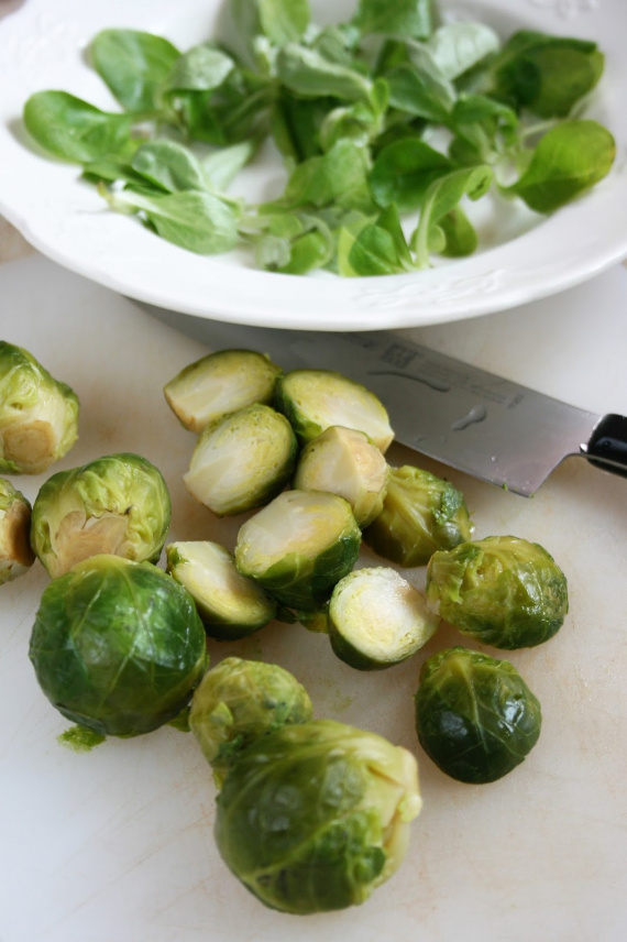 Между тем отварите брюссельскую капусту. Для этого вскипятите литр воды, добавив в нее половину чайной ложки сахара и чайную ложку соли. Отправьте в кипящую воду капусту и варите ее в течение 8-10 минут. Затем откиньте кочаны на дуршлаг и нарежьте четвертинками или половниками.