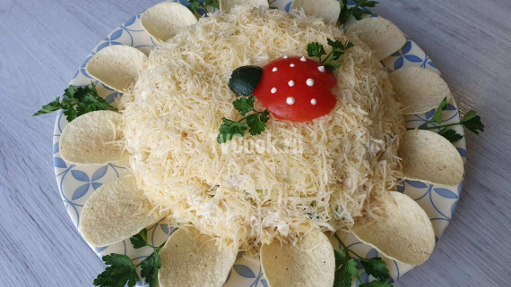 С помощью формы или собственной аккуратности, переложите салат на блюдо для подачи. Сверху посыпьте его оставшимся тертым сыром. А затем по желанию можете украсить салат чипсами по краю или добавив в центр божью коровку из кусочка помидора, маслины и майонеза.