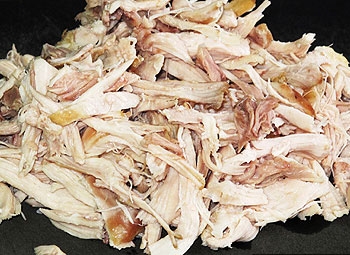 Куриную грудку разделяем на волокна. Внимание! Можно производить данную операцию вручную, а можно – при помощи вилки, аккуратно отделяя маленькие кусочки мяса от большого куска.