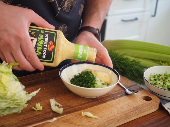 Соус нужен освежающий, отлично подходит огуречный. Можете, так же, выбрать другую заправку, на свой вкус (можно заменить сметаной или майонезом с небольшим количеством горчицы), но обязательно попробуйте этот коктейль с огуречным соусом (в составе которого есть маринованные огурцы). Для того, чтобы вкус получился еще ярче, соус смешиваю с мелко нарезанным стеблем сельдерея и зеленью укропа.