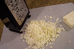 - С помощью крупной терки измельчаем плавленый сырок прямо над глубокой пиалой. Внимание: чтобы с легкостью подготовить этот ингредиент, нужно его заранее охладить в холодильнике. Кстати, именно благодаря такому сыру салат получится очень нежным и в меру соленым, так что можете даже в него не добавлять никакие специи и соль.
