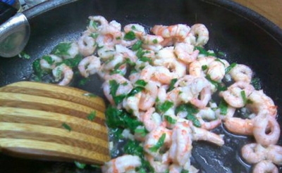 Сковороду поставьте на средний огонь, затем добавьте в нее растительное масло, затем мелко измельченный зубчик чеснока. Немного обжарьте его, но не допустите, чтобы чеснок потемнел. Как только Вы почувствуете его аромат, сразу же добавляйте очищенные креветки. Перемешивайте деревянной лопаткой. В это время мелко измельчите зелень петрушки и также добавьте в сковороду. Лайм или лимон ополосните под холодной проточной водой, затем разрежьте пополам и выдавите в сковороду сок половинки цитруса. Немного поперчите, затем хорошенечко перемешайте. Обжаривайте все до тех пор, пока вся жидкость не выпариться. Это займет не больше нескольких минут.