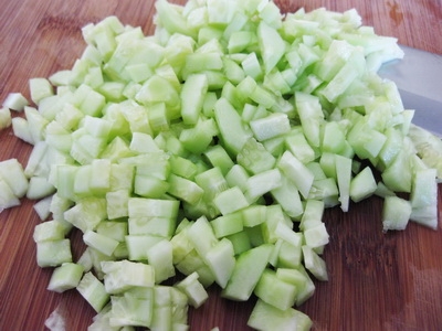 - Огурец промываем под проточной водой, очищаем от кожицы и нарезаем на разделочной доске небольшими кубиками.