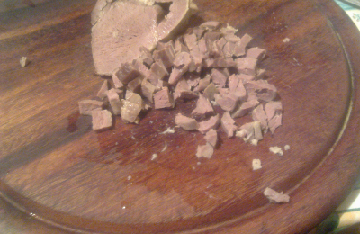 - Очищаем сердце от плёнок и нарезаем на мелкие кубики. Перекладываем в отдельную тарелочку.
