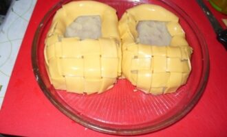 - Делаем плетенку на лаптях. Разрезаем ломтики сыра на полоски и аккуратно плетем, чтобы накрыть ‘носок’ каждой картофельной лодочки.