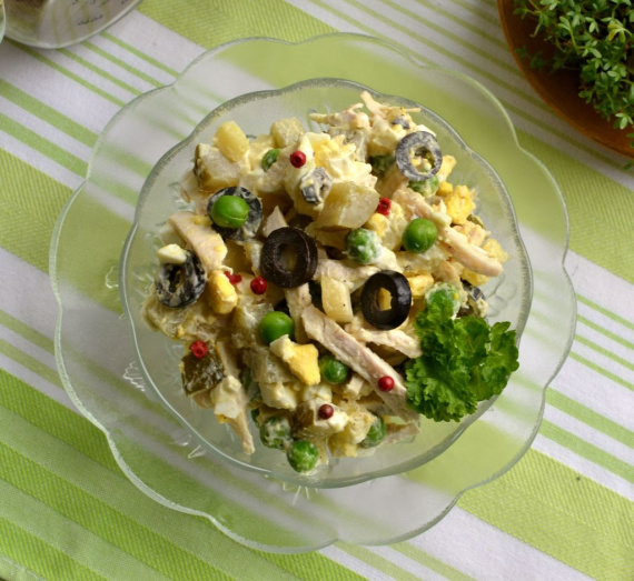 Теперь картофель, оливки, горошек, яйца и огурцы соедините в подходящей по размеру салатнице. Все ингредиенты должны быть остывшими, примерно комнатной температуры.