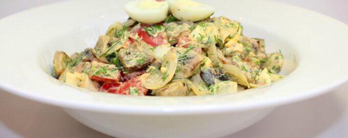 Баклажановый салат — очень вкусный и сытный. Прост в приготовлении. Его аромат тянет к столу, чтобы скорее его попробовать. Баклажаны в этом салате очень похожи на грибы. Одним словом ВКУСНОТИЩА!
