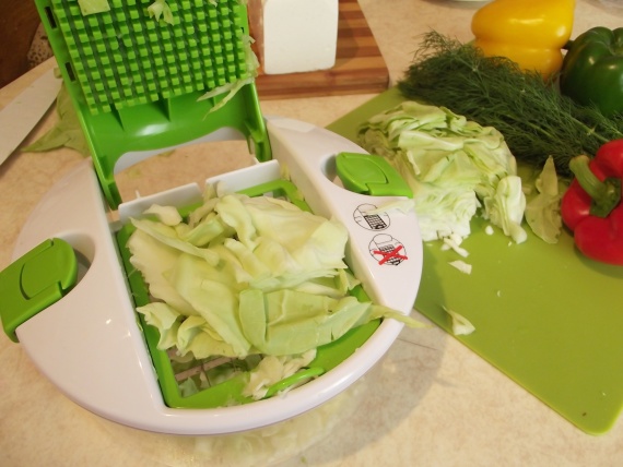 - Затем все подготовленные овощи нужно нарезать для салата. Нарезать их нужно так, чтобы все кусочки были примерно одного размера. И чтобы сэкономить силы и время, я предлагаю воспользоваться овощерезкой. Сперва капустные листья, при этом их не надо ни мять, ни отжимать. Просто нарежьте и ссыпьте в салатницу пока что.