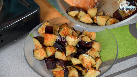 Ставим на включенную плиту сковороду, затем выливаем в нее 5 ст.л. растительного масла и нагреваем, после чего нарезаем небольшим кубиком 2 баклажана, которые выкладываем в сковороду и перемешивая обжариваем на большом огне плиты.