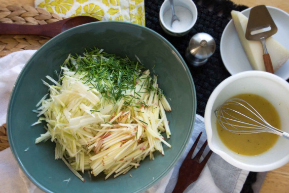Капусту кольраби и яблоки нужно промыть, очистить от шкурки ножом (а яблоки еще и вычистить от семян), а затем нарезать их тонкой соломкой. Если есть специальный нож для шинковки овощей, то вообще замечательно! Красный лук очистите от шелухи, а зеленый просто очень хорошо промойте, затем мелко накрошите и то, и другое. Сыр натрите или нарежьте специальным ножом на крупные, но тонкие хлопья.