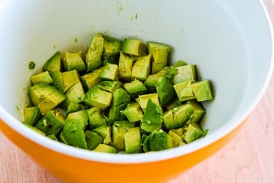 Авокадо разрежьте вдоль, не дорезая до косточки, а затем просто разведите их в разные стороны, постепенно проворачивая вокруг центра. Освободите мякоть фрукта от кожуры, выньте твердую косточку. Нарежьте авокадо небольшими кубиками, желательно, чтобы они совпадали по размеру с кусочками огурца.