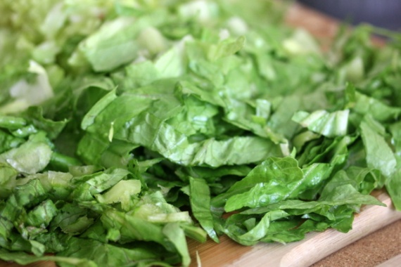 Листья салата промойте теплой водой, отряхните от лишней влаги. Разложите их на разделочной доске и нарежьте толстыми или нашинкуйте тонкими полосочками, на ваше усмотрение.