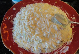 - Теперь добавляем яйца. Также смазываем их майонезом и сразу же после этого посыпаем все тертым сыром.